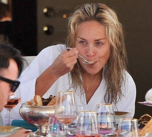 Во вторник Шэрон Стоун продемонстрировала на своем примере, как макияж и одежда могут менять человека в течение дня. Солнечным утром актриса была замечена на яхте модельера Роберто Кавалли, которая пришвартована на набережной Канн. В потрепанных джинсах, полосатом пуловере и без макияжа, ее вид был далек от гламурного.