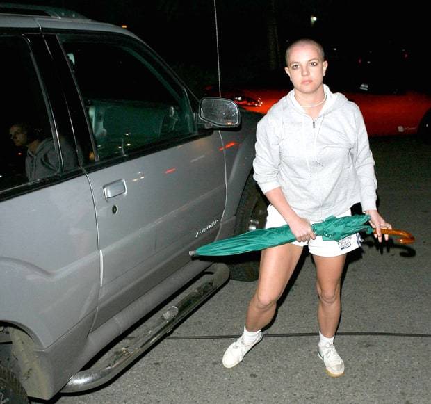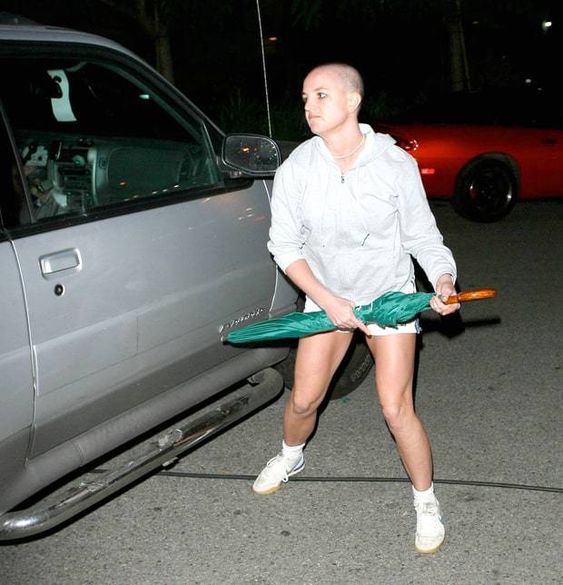Бритни Спирс. 16 февраля 2007 года она внезапно решила побрить свою голову налысо. Спустя несколько дней, она шокировала своих поклонников по всему миру, яростно накинувшись с зонтиком на машину папарацци.