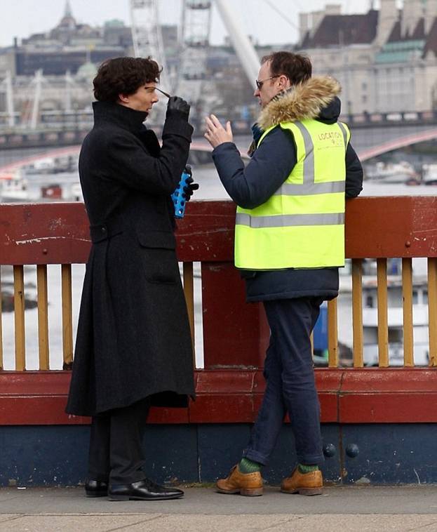 Сегодня на набережной Темзы можно было наблюдать за работой Бенедикта Камбербэтча, который играет Холмса.