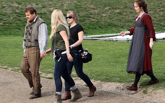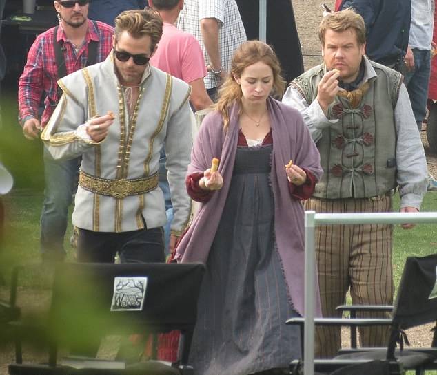 Беременная Эмили Блант (жена пекаря). Крис Пайн (Принц Золушки) и Джеймс Корден (пекарь)