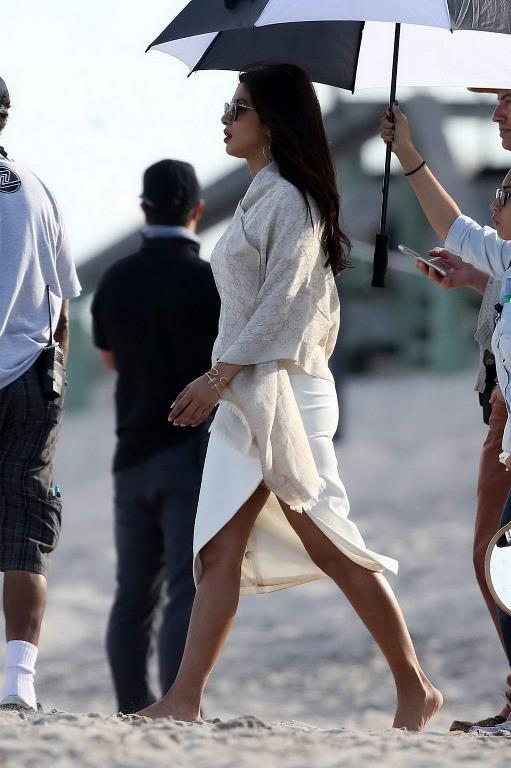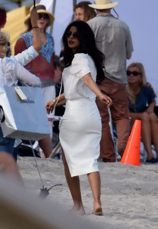 В перерывах между дублями, когда Зак Эфрон и Дуэйн Джонсон тренируются, красавица Чопра прогуливается по пляжу.