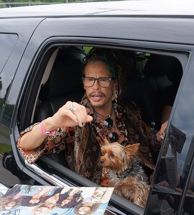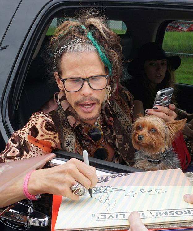 Он известен своим эклектичным стилем как на сцене, так и вне ее. И в субботу Стивен Тайлер в очередной раз продемонстрировал его в Бостоне, когда подписывал автографы своим фанатам прямо из машины.