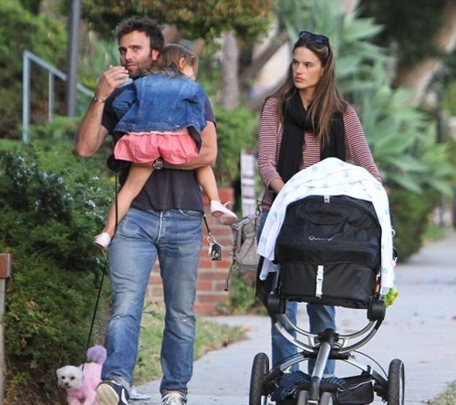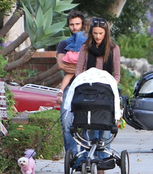 Бразильская красавица Алессандра Амбросио вместе со своей семьей наслаждалась прогулкой по улицам Санта-Монике. В то время, как Алессандра везла коляску с маленьким сыном Ноя, ее жених, калифорнийский бизнесмен Джейми Мазур, нес их 3-летнию дочь Аню на руках и вел на поводке домашнего любимца, который был розового цвета.
