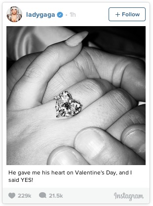 Наконец-то это свершилось! Леди Гагасообщила, что она приняла предложение ее возлюбленного Тейлора Кинни. Поп-звезда и ее бойфренд обручились в День святого Валентина, после чего отпраздновали радостное событие в ресторане на Манхэттене за запланированным ужином с семьей певицы.