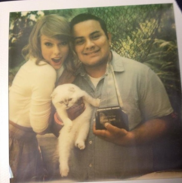 Тейлор Свифт позировала со своими фанатами, ее кошкой Оливией Бенсон и одной из ее многочисленных наград на камеру во время проведения секретной вечеринки под названием "1989" в своем доме в субботу, 20 сентября, в Лос-Анджелесе.