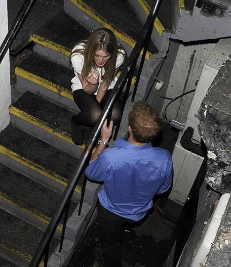 Принц Гарри только что закончил свое турне по странам Карибского бассейна от имени своей бабушки, и решил расслабится в одном из ночных клубов Лондона. Сразу же появились фотографии, где он общается с блондинкой в клубе, причем девушка сидит на лестнице без обуви и курит, а Гарри просто стоит и разговаривает с ней.