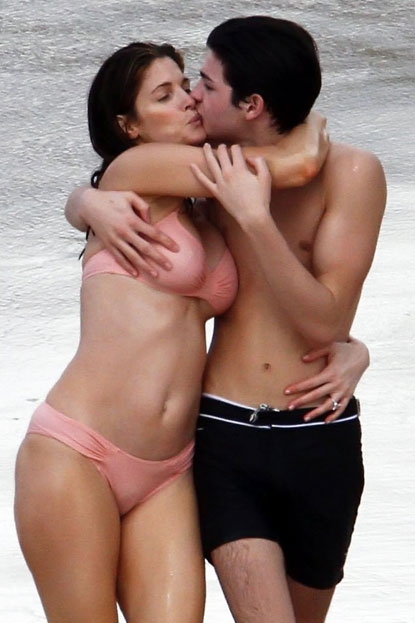 Не типичный поцелуй мать-сын, модель Стефани Сеймур с сыном на пляже.