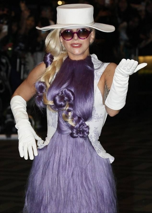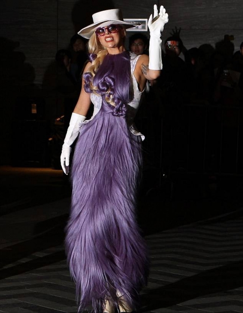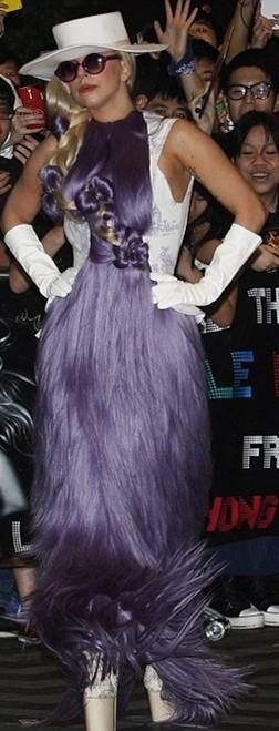 Она всегда ищет новые идеи для своего образа, думает чем может удивить своих фанатов. Кажется, после ее шокирующего платья с сырого мяса, трудно уже нас чем либо удивить, но это не так. Сегодня, Леди Гага прибыла в Гонконг, одетая в платье из фиолетовых волос.