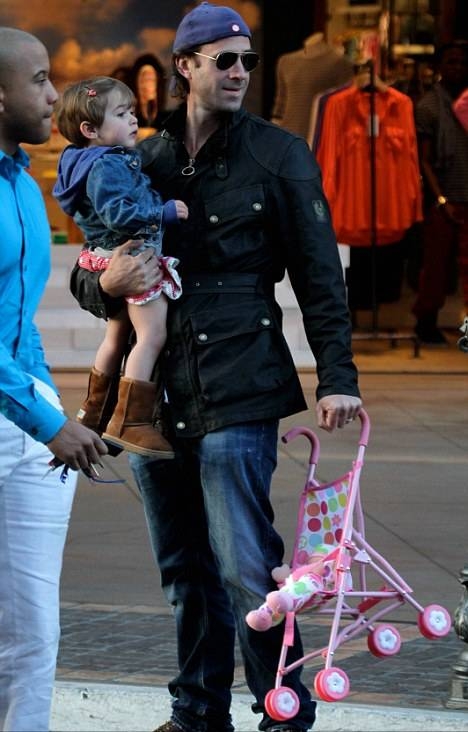 41-летний актер был замечен со своей двухлетней дочерью на одной руке, и розовой детской коляской в другой. Это старшая дочь актера и его жены швейцарской модели Марии Долорес Дьегес.