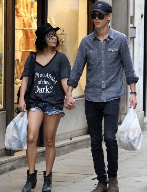 Трио, к которому присоединился бойфренд Ванессы Остин Батлер, начало свой осмотр с магазинчика, где девушки приобрели венецианские маски.
