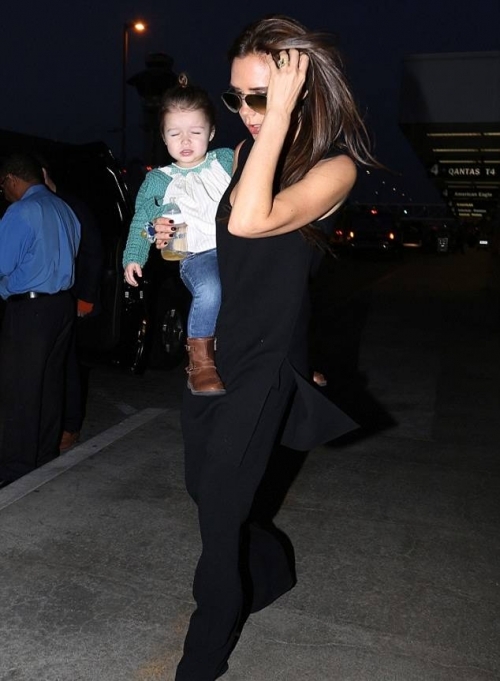 Несмотря на многочасовой перелет и довольно позднее время, дети с Викторией выглядели довольно бодро, лишь Харпер, находясь на руках у Виктории, изредка жмурилась от многочисленных фотовспышек от камер папарацци.