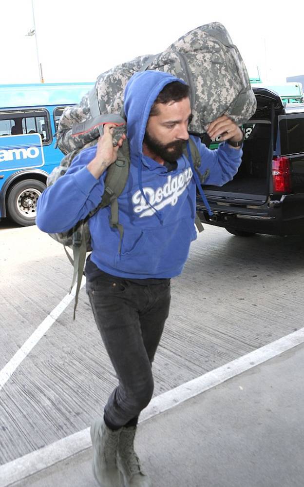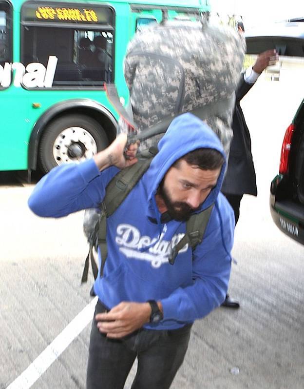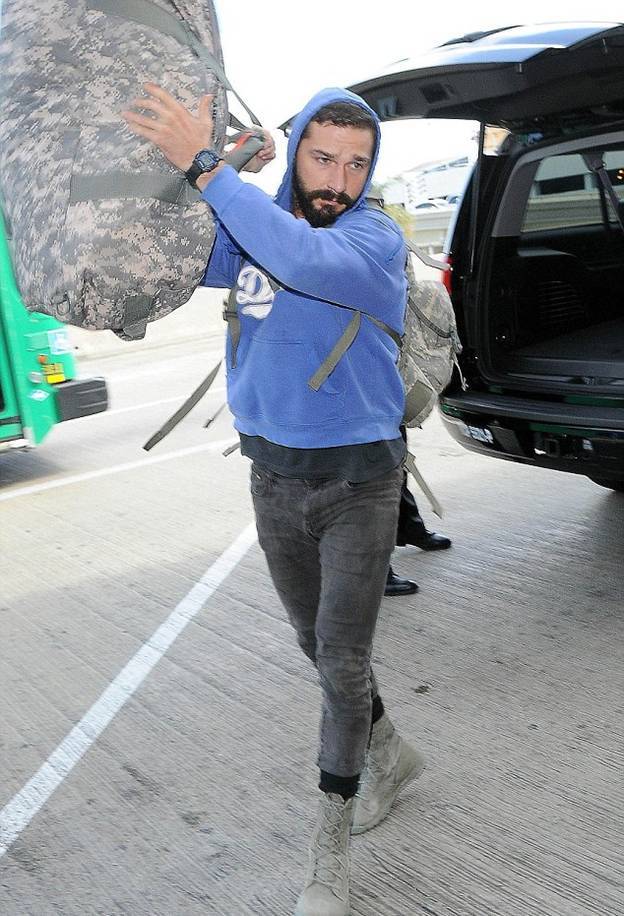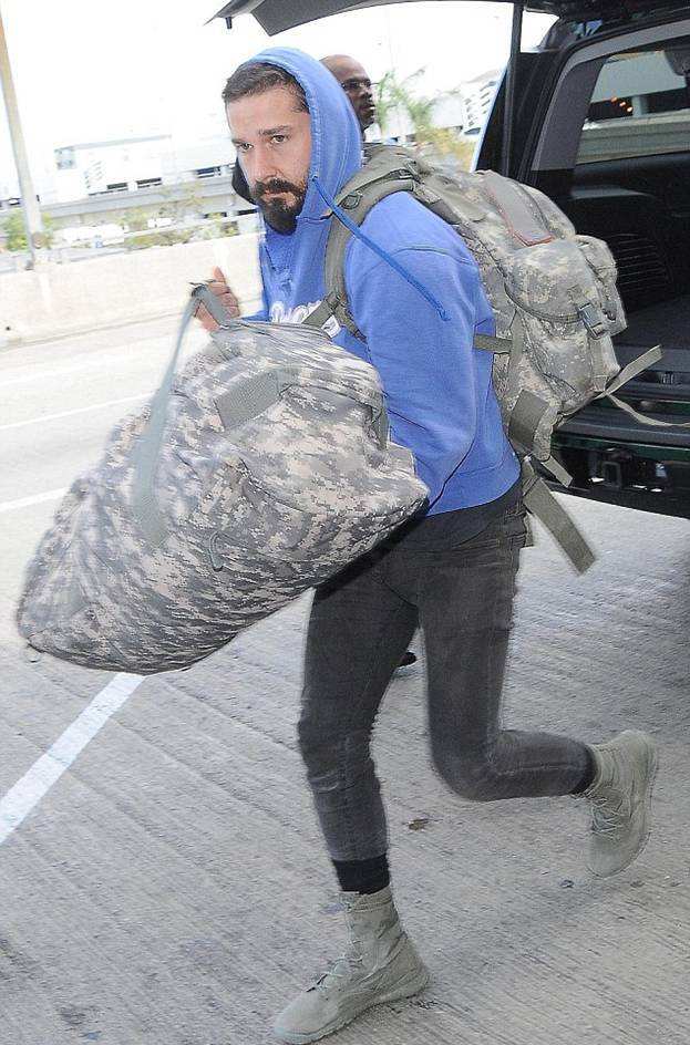В последнее время он любит использовать в своей одежде военную тематику, и его часто можно было увидеть в штанах цвета хаки и высоких ботинках, которые так обожают носить солдаты. В этот же раз Шайа ЛаБаф решил использовать рюкзак и сумку так полюбившегося стиля.