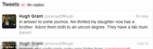 В субботу на своем твиттере Хью Грант объявил, что стал счастливым отцом во второй раз, и у его дочери теперь есть брат. Что интересно, матерью ребенка стала снова гонконгская модель и актриса Тинглан Хонг, которая на 19 лет моложе его.
