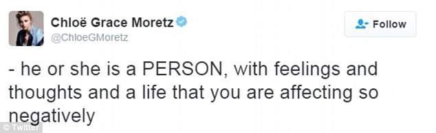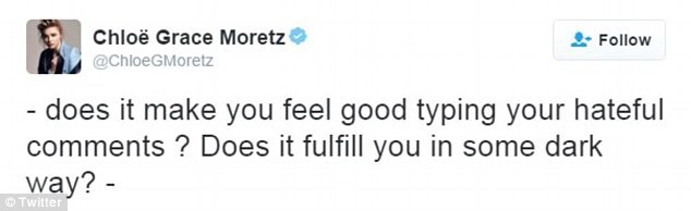 Хлоя Морец ответила хейтерам, которые пишут негативные комментарии и постоянно обсуждают её внешность. "Когда люди, которые прячутся за мониторами, устанут писать другим, что они "жирные и мужеподобные"...", - написала 19-летняя актриса в Твиттере.