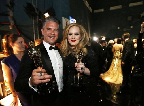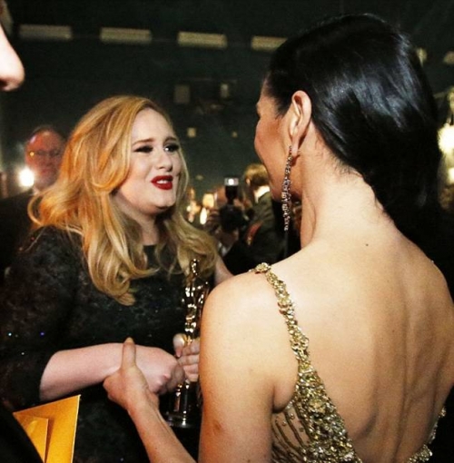 Ричард Гир и Рене Зеллвегер готовятся выйти на сцену, чтобы вручить Оскара Адель, за лучший саундтрек к последнему фильму о Бонде