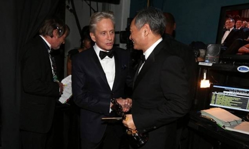 Майкл Дуглас разговаривает с режиссером Энг Ли, получивший статуэтку, как «Лучший режиссер»