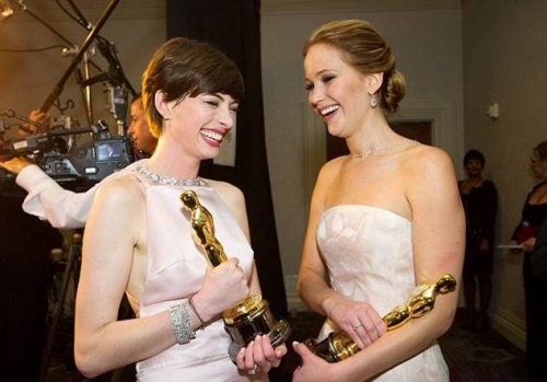 У Дженнифер Лоуренс прекрасное настроение, несмотря на ее падение на сцене. Надо заметить, что Дженнифер уже традиционно отличается на таких крупных торжествах. Так, на Золотом глобусе, она порвала при всех платье, и во время награждения, ей пришлось его держать руками.