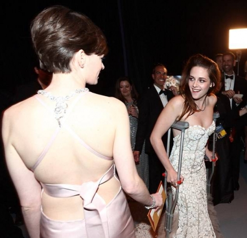 Хотя на красной ковровой дорожке и на сцене Кристен Стюарт была без костылей, за кулисами она ходила с ними. По сообщениям, 22 летняя актриса получила травму ноги за день до Оскара, сильно порезав ее об стекло.
