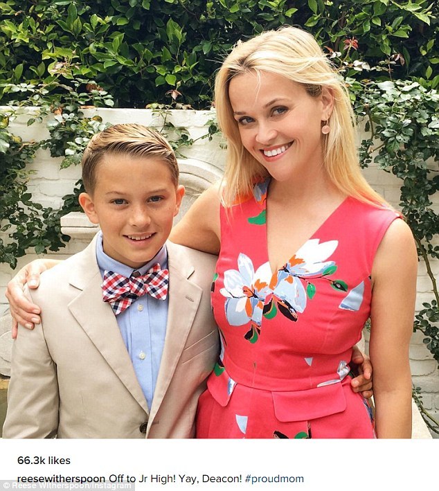 Риз Уизерспун не только актриса с мировым именем, а в первую очередь мама троих детей. И она не смогла сдержать радость, поделившись на выходных со своими поклонниками, что ее сын Дикон перешел в среднюю школу (в США средняя школа,это 7-8 классы).