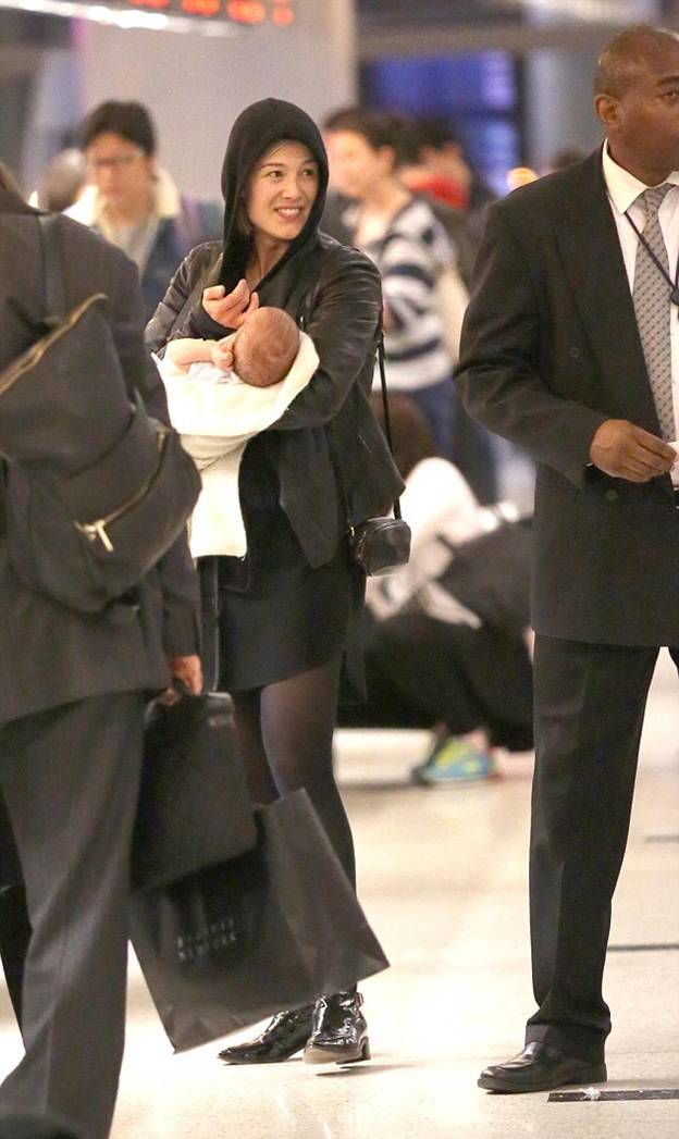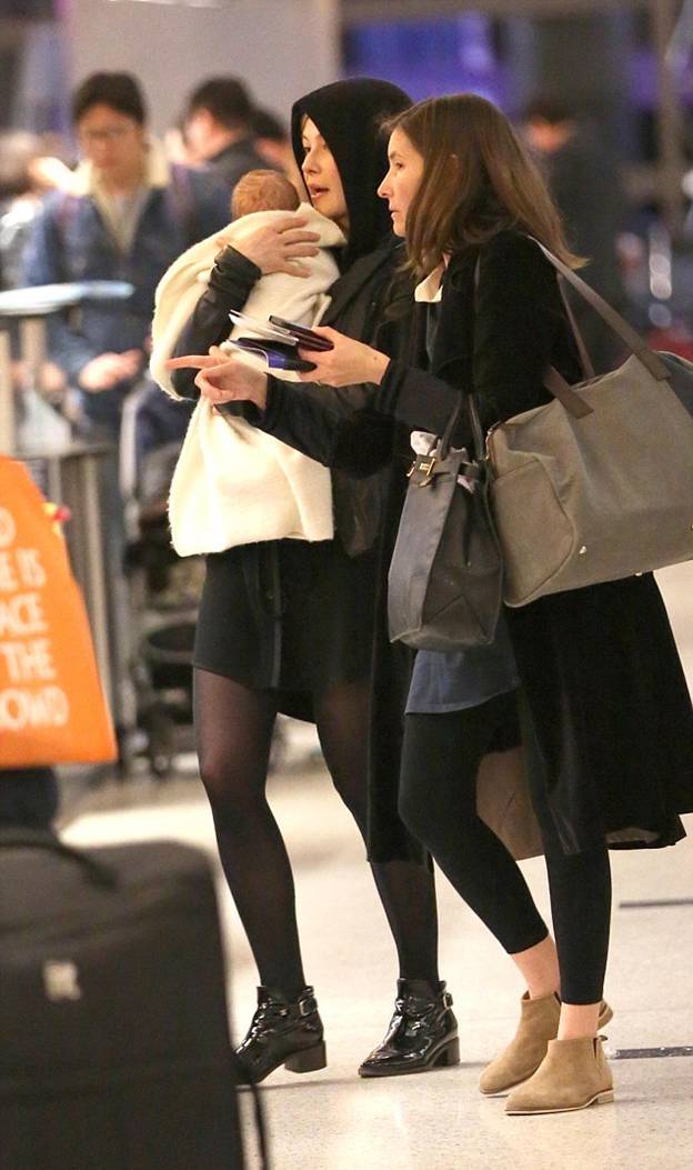 Розамунд Пайк была замечена со своим полуторамесячным сыном Атомом в аэропорту Лос-Анджелеса в пятницу.