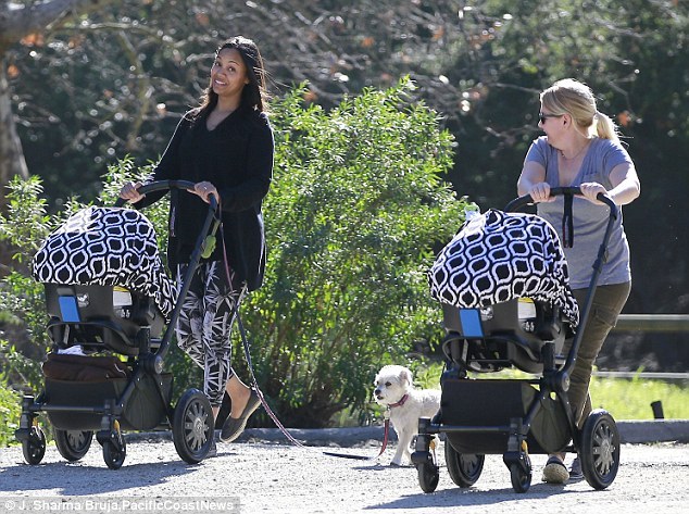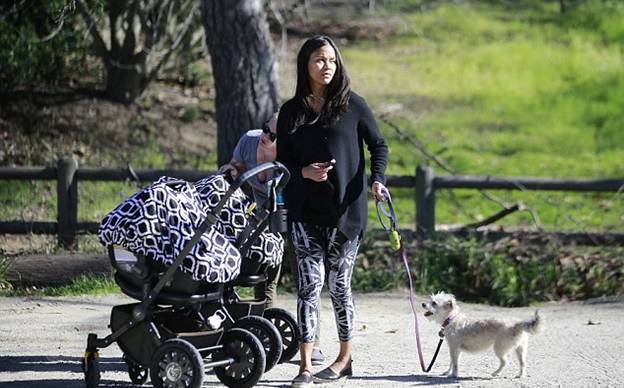 Она гуляла с ними в районе Каньон-Парка, взяв в помощницы, по всей вероятности, няню, которая помогала ей управляться со второй коляской. Также компанию им составляла собака актрисы - Микси.
