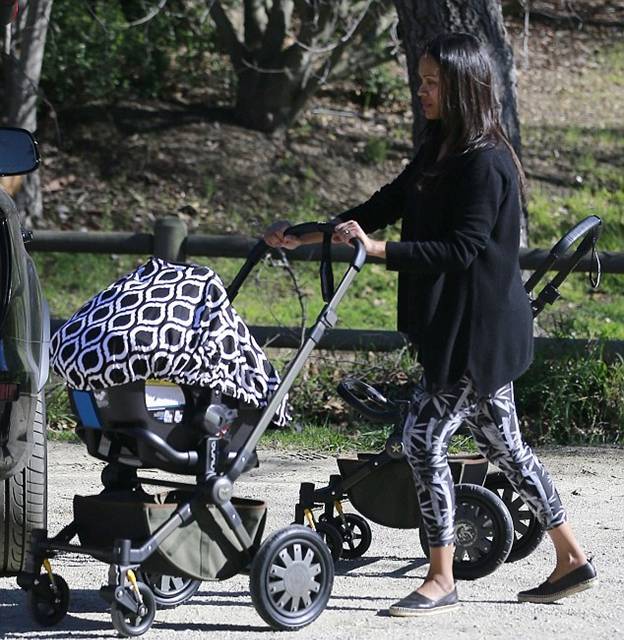Зои Салдана впервые была замечена на прогулке со своими сыновьями-близнецами, трехмесячными Боуи и Саем.