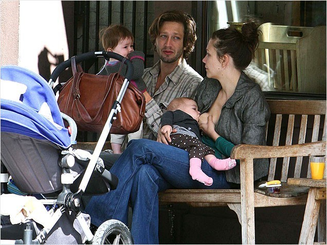 Мэгги Джилленхол кормит свою дочь Рамону прямо в уличном кафе в центре Нью-Йорка.